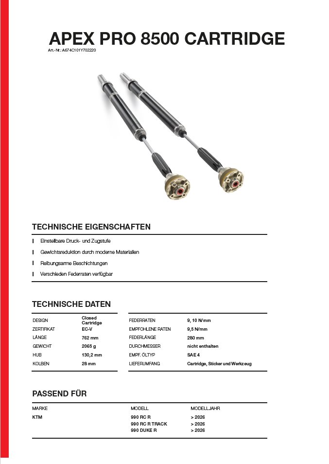 Herzstück ist die APEX PRO 8500 Cartridge mit moderner Closed-Cartridge-Technologie. Durch die Trennung des Dämpfungssystems wird Kavitation verhindert und eine konstante, präzise Dämpfungsleistung selbst unter extremen Bedingungen sichergestellt – für maximale Rennstrecken-Performance und spürbaren Komfort auf der Straße.