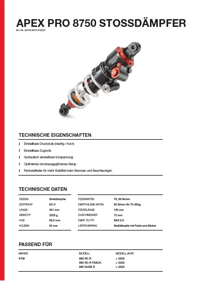 Ergänzt wird das Setup durch das APEX PRO 8750 Federbein, das für überlegenen Grip, frühe Beschleunigung und hohe Stabilität sorgt. Das schlanke Inline-Design, umfangreiche Einstellmöglichkeiten und hochwertige Komponenten garantieren präzises Feedback, maximale Traktion und gleichbleibende Performance – selbst am Limit.